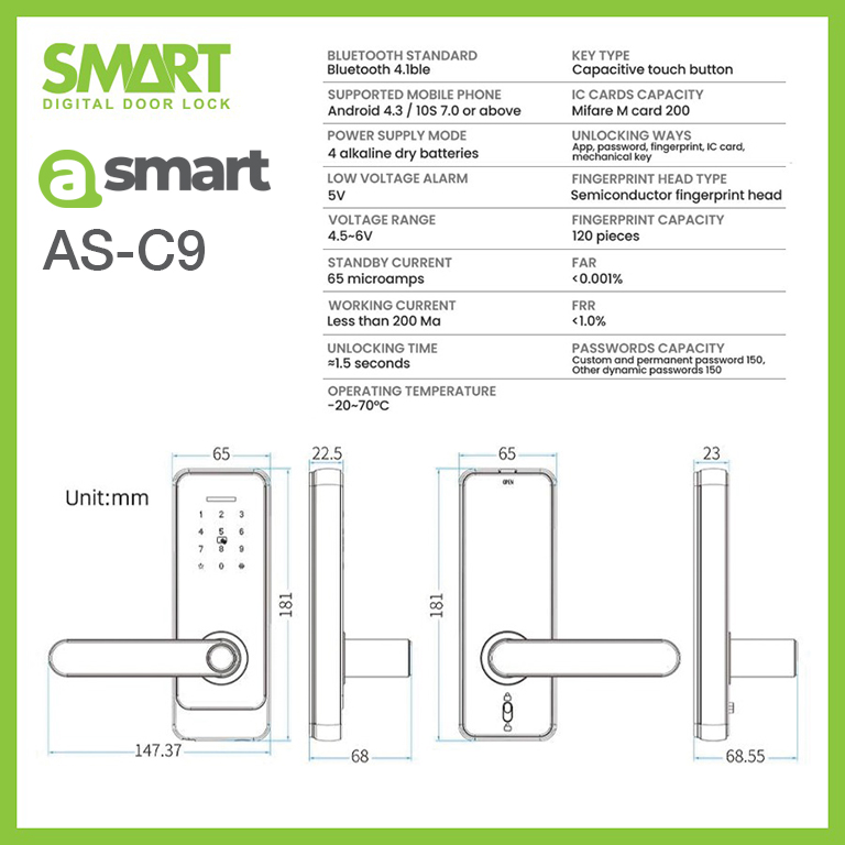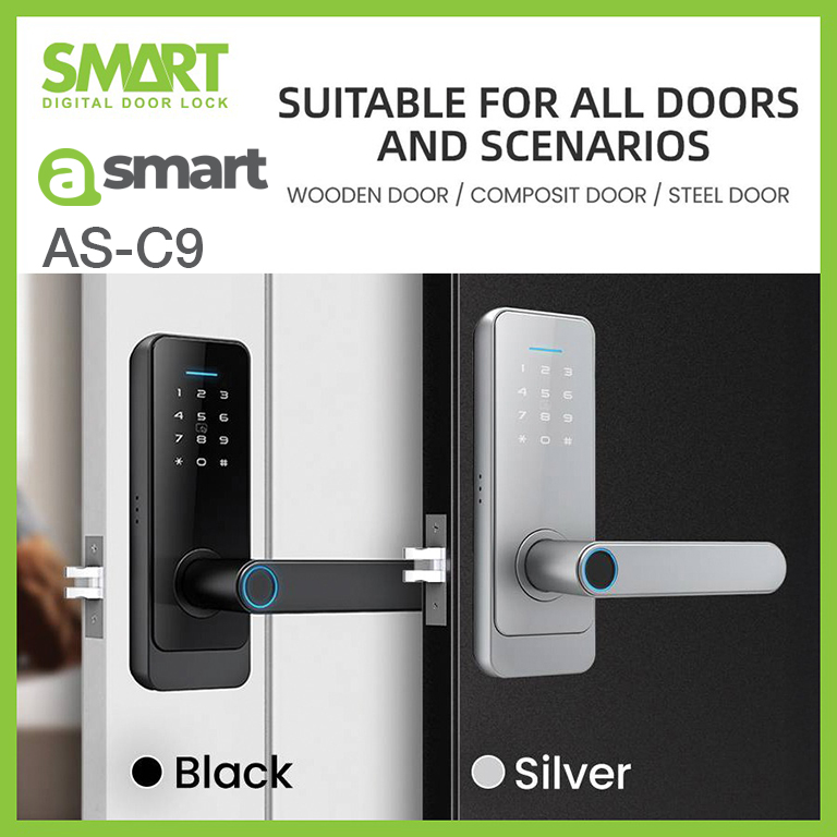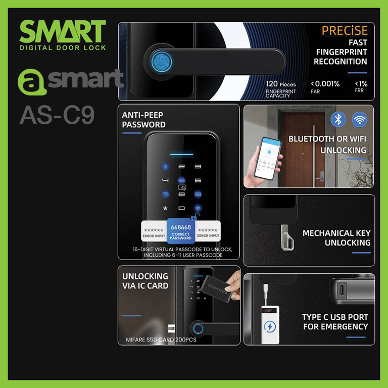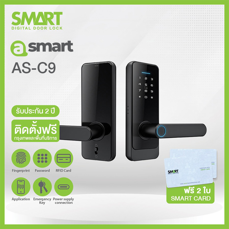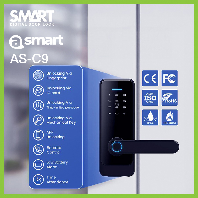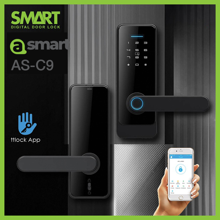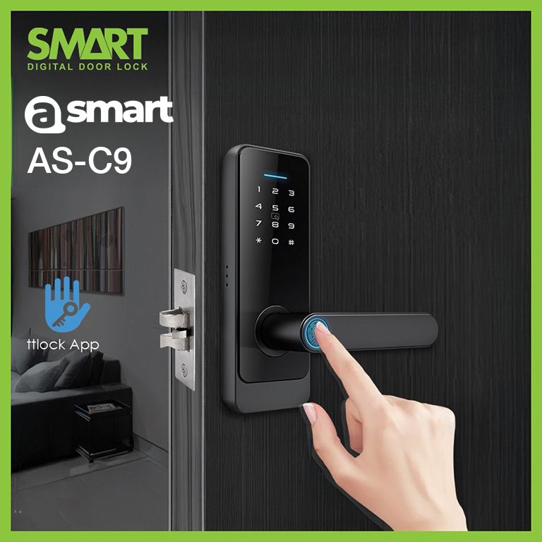 กลอนดิจิตอลรุ่น A Smart รุ่น AS-C9 สำหรับประตูคอนโดและประตูห้องพัก ออกแบบมาเพื่อเปลี่ยนแทนลูกบิดเดิมโดยไม่ต้องถอดวงกบใหม่ ปลดล็อกได้ 5 แบบ: สแกนนิ้ว, รหัส, การ์ด, กุญแจสำรอง และแอป TTLock (Bluetooth) เหมาะกับคอนโด, หอพัก, ห้องเช่า และ Airbnb
